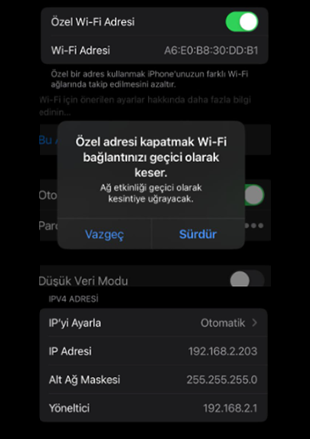 Iphone telefonlarda Özel Ağ ayarını kapatmak için ilgili adımlar aşağıdaki gibidir :