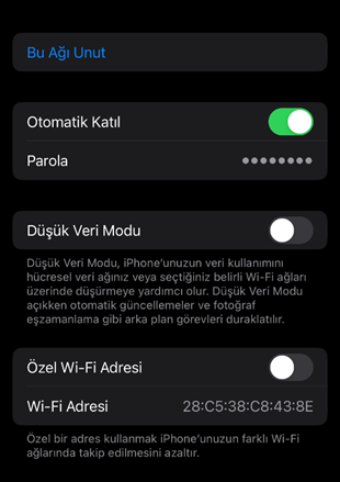 “Özel Wi-Fi Adresi (Private Wi-Fi Address)” bu şekilde kapalı olarak görünecektir.